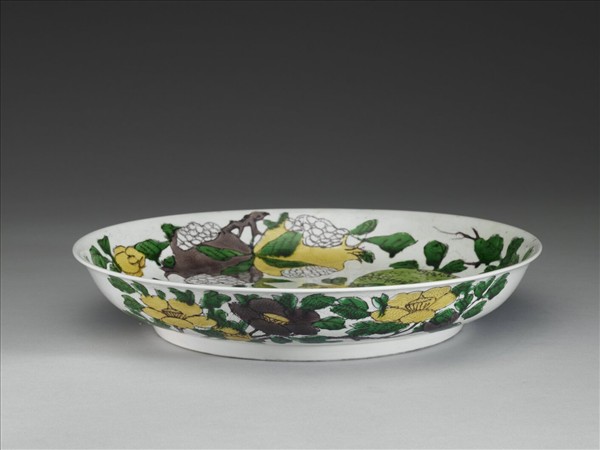 撇口碗,淺弧壁,圈足矮寬。器內外壁皆施白釉。器內滿畫黃綠色帶葉花果,外壁亦飾相同花果兩叢。外底心書「大清康熙年製」雙行雙圈青花楷書款。