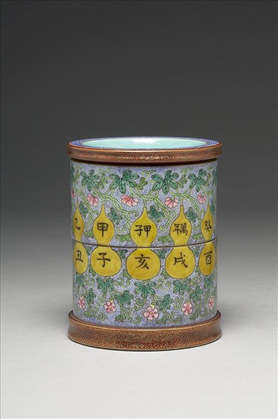 清朝景德鎮在乾隆八年(1743)時,以創新的姿態製作出能轉動的瓶,稱之為交泰瓶。此筆筒可旋轉活動,製做時以口緣連器內壁為一片,器底為一片,器外壁下、上半身各為一片,共四片燒成後組合而成的。將外壁上、下部分套入內壁,將器底盤與內壁底黏合,則器外壁上部可旋轉自如。器外壁上、下部分合畫成葫蘆瓜形開光,其內於黃釉地上墨書十個天干、十二個地支,兩者配台轉一輪其最小公倍數為六十,即是中國一甲子六十年的中國萬年甲子曆。器外壁以葫蘆、葉藤作連續圖案裝飾,以藍釉卷草紋成錦地,以喻瓜瓞綿延。器內壁及器底皆以碧湖綠彩釉,底有留方格空白書以紅彩「乾隆年製」篆款。