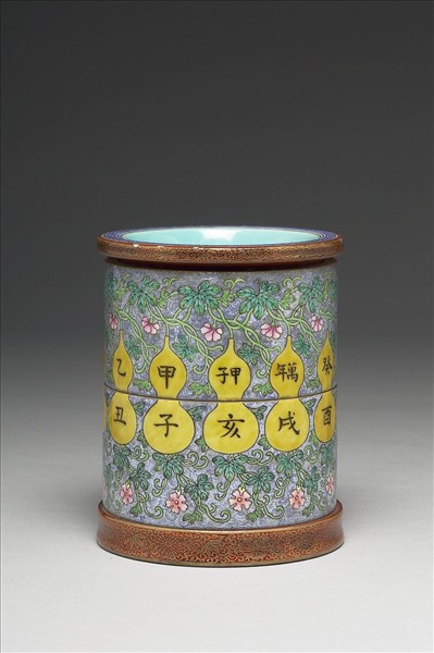 器作直筒形,口足出沿如鑲邊,筒壁上下可以轉動。器分四片接合,口沿連器內壁一片,底座一片,筒壁上下分別套入內壁後,再將底座與內壁底邊接榫套合,上下即可轉旋自如。口足各畫紅地描金纏枝花卉錦紋,器身通體以藍料繪卷草錦地紋,餘隙上下描繪瓜藤及瓜花,中段則巧妙地於上下筒壁間,畫出由藤蔓長出的十二箇接合的黃葫蘆,上段墨書「萬年」、「甲子」、及十天干,下段為十二地支,上下轉旋配合,可以變換一甲子六十年,故名甲子筆筒。內壁及底通施湖綠釉,底心留白框內紅料書「乾隆年製」二行四字篆款。
