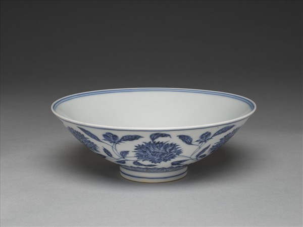 侈口,淺壁,矮圈足。外壁畫纏枝番蓮花六朵,底邊畫蓮瓣紋一周,口足間加飾青線六道。碗內底心畫葵花一朵,邊加雙線,周壁純白無紋飾。底有青花書「大明宣德年製」二行六字楷款,外加雙圈。