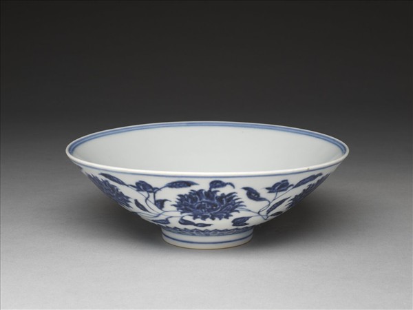 侈口,淺壁,矮圈足。外壁畫纏枝番蓮花六朵,底邊畫蓮瓣紋一周,口足間加飾青線六道。碗內底心畫葵花一朵,邊加雙線,周壁純白無紋飾。底有青花書「大明宣德年製」二行六字楷款,外加雙圈。