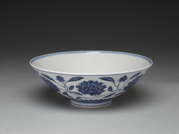 侈口,淺壁,矮圈足。外壁畫纏枝番蓮花六朵,底邊畫蓮瓣紋一周,口足間加飾青線六道。碗內底心畫葵花一朵,邊加雙線,周壁純白無紋飾。底有青花書「大明宣德年製」二行六字楷款,外加雙圈。