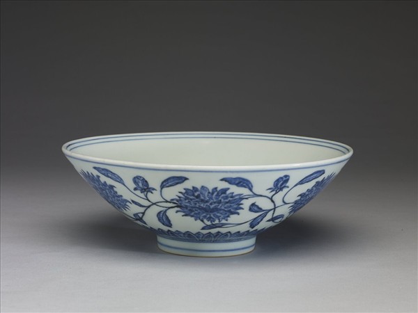侈口,淺壁,矮圈足。外壁畫纏枝番蓮花六朵,底邊畫蓮瓣紋一周,口足間加飾青線六道。碗內底心畫葵花一朵,邊加雙線,周壁純白無紋飾。底有青花書「大明宣德年製」二行六字楷款,外加雙圈。