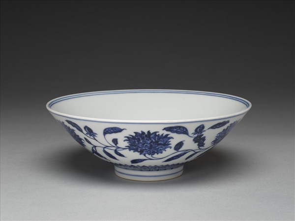 撇口,斜直壁,平底,矮圈足。 惟本器芍藥花朵較為呆板,無前器之生動自然。青花艷麗濃重,深處多帶褐綠色斑及鐵褐色結晶疵斑,白釉微泛青。胎骨均勻,胎質潔白細膩。器底青花書「大明宣德年製」二行六字楷款,外加雙圈。