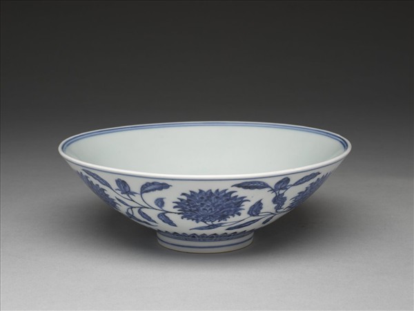 侈口,淺壁,矮圈足。外壁畫纏枝番蓮花六朵,底邊畫蓮瓣紋一周,口足間加飾青線六道。碗內底心畫葵花一朵,邊加雙線,周壁純白無紋飾。底有青花書「大明宣德年製」二行六字楷款,外加雙圈。