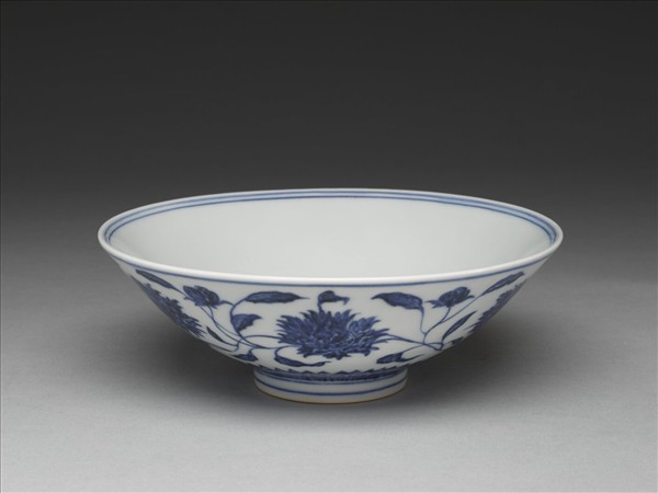 侈口,淺壁,矮圈足。外壁畫纏枝番蓮花六朵,底邊畫蓮瓣紋一周,口足間加飾青線六道。碗內底心畫葵花一朵,邊加雙線,周壁純白無紋飾。底有青花書「大明宣德年製」二行六字楷款,外加雙圈。