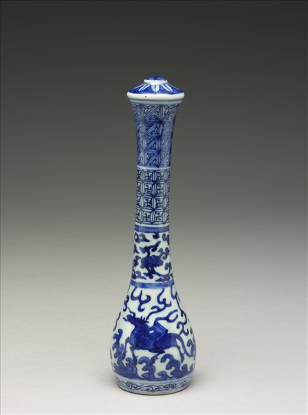 斗筆管,圓頂帶鈕,上端稍侈,管直而長,而筆斗處碩大,以納筆毫於內。管內中空,近管口處的底板有氣孔。外表以青花為飾,青色鮮濃,白釉稍帶青調。是萬曆時期常見的釉色。鈕飾五瓣花、蕉葉紋。管身以弦紋分為四層紋飾,依次為四方連續的六邊朵花錦、卍字錢紋錦、轉枝靈芝花、河圖洛書圖及卷草紋。河圖洛書是太平盛世的祥瑞象徵,圖繪一隻駝著書卷的大龜和一匹背著圖冊的寶馬,《易.繫辭》:「河出圖,洛出書,聖人則之」,相傳為伏羲時黃河出圖冊,由龍馬背負著;大禹時洛水出書卷,為神龜所駝。