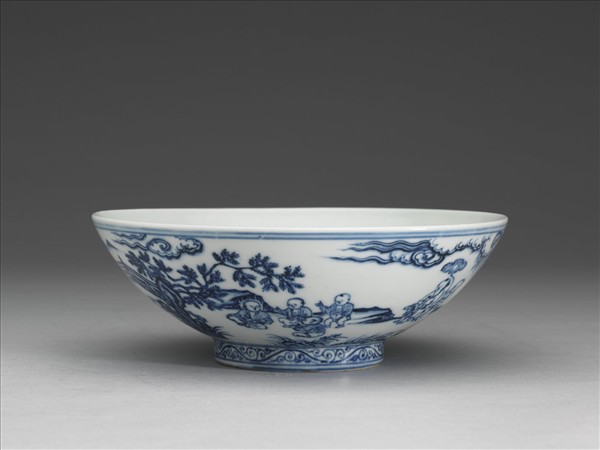 碗 ,侈口、淺弧壁、外底微凸、矮圈足。胎骨勻厚,表面以青花彩繪紋飾,通體施白釉,足緣無釉露胎;青花濃豔鮮麗,帶滲青斑點,圍欄線條和輪廓線尤甚。器外口沿繞雙弦紋,腹壁繪中式山水、園林奇石景致,見十六童子嬉戲於庭園中;外足圈飾卷草一周,上下均繞雙弦紋。器底有青花書「大明宣德年製」六字二行楷款,外加雙圈。