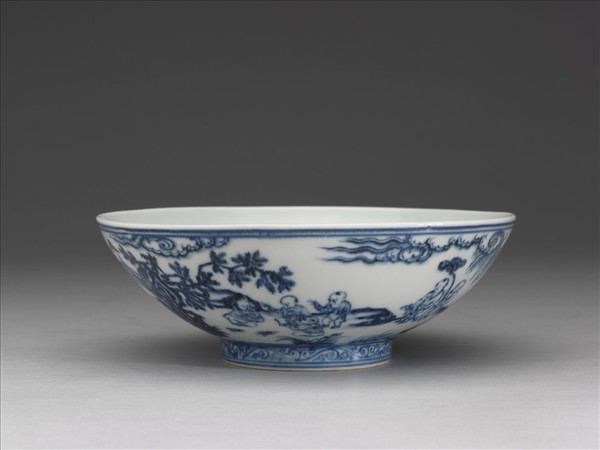 侈口碗,淺弧壁,矮圈足。外口沿及底邊各畫青花弦紋二道,外壁以青花畫十六嬰兒嬉戲圖。足壁畫青花勾雲紋一周,上下端亦畫青花弦紋二道;內面純白,樸素無紋飾。外底心書「大明宣德年製」青花雙行雙圈楷書款。
