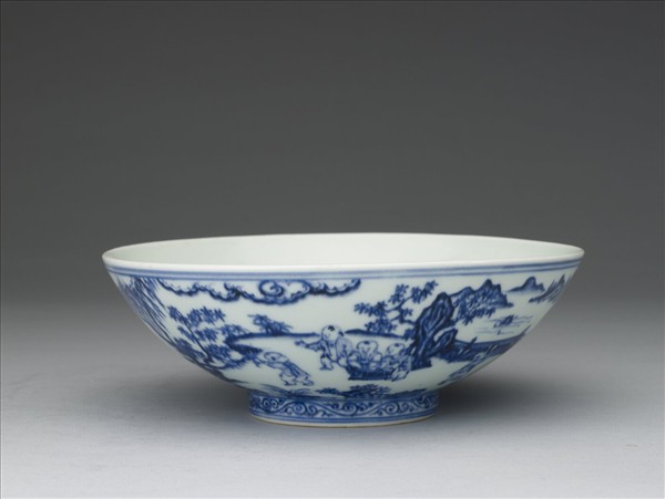 侈口,弧壁,矮圈足,底微凸。外壁繪山水、園林奇石景致,中有十六童子於庭園中嬉戲,足圈畫卷草一周,口、足加飾青線六道,器內純白無紋。胎骨較厚,青花濃重,白釉微泛青色。器底書「大明宣德年製」二行六字楷款,外加雙圈。