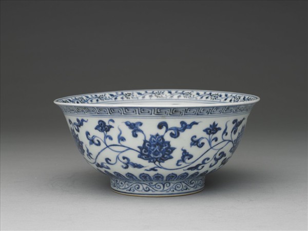 撇口碗,窄唇,深弧壁,矮圈足。碗內口沿畫青花轉枝菊花,內壁畫纏枝四季花五朵,碗心有青花雙圈,內畫番蓮一枝;外口沿回紋一道,外壁飾纏枝番蓮五朵。底邊為蓮瓣紋,足壁畫鈎雲紋。內外紋飾間加飾青花弦紋共九道。外底心書「大明宣德年製」青花雙行雙圈楷書款。