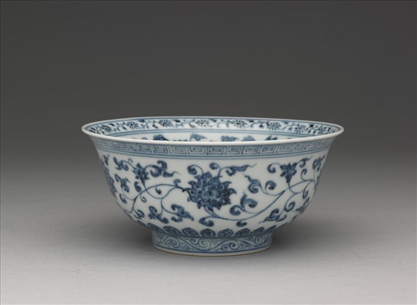 侈口窄唇,深壁,矮圈足。碗內口唇上畫轉枝菊花一周,內壁畫纏枝四季花五朵,碗心畫番蓮一枝。外面口沿下畫回紋一道,周壁畫纏枝番蓮五朵,底邊畫蓮瓣紋,足圈畫卷草紋。內外花紋間加飾青線十一道。底有青花書「大明宣德年製」六字二行楷款,外加雙圈。
