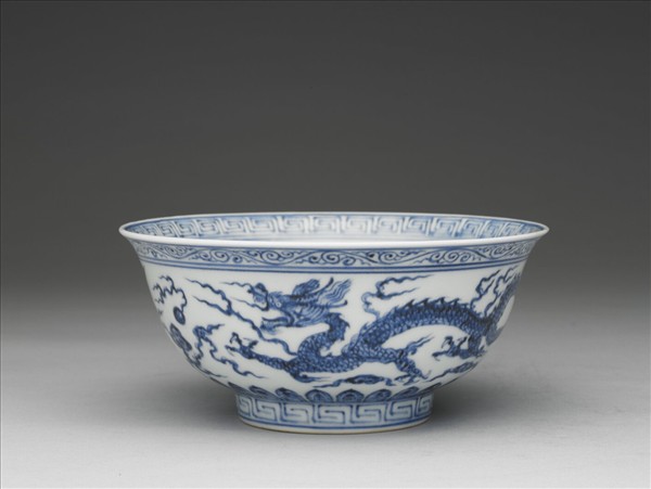 侈口,深壁,矮圈足。內壁口沿下畫回紋一道,周壁畫纏枝菊花五朵,碗心畫葵花一枝。外口沿下畫卷草紋一道,周壁畫雙龍戲珠,底邊畫蓮瓣紋,足畫回紋一周。底有青花書「大明宣德年製」六字二行楷款,外加雙圈。