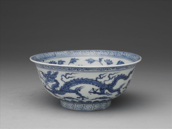 侈口,深壁,矮圈足。內壁口沿下畫回紋一道,周壁畫纏枝菊花五朵,碗心畫葵花一枝。外口沿下畫卷草紋一道,周壁畫雙龍戲珠,底邊畫蓮瓣紋,足畫回紋一周。底有青花書「大明宣德年製」六字二行楷款,外加雙圈。
