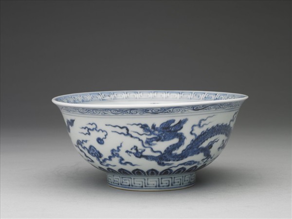回紋一圈,周壁畫三爪雙龍趕珠,加飾雲紋,底邊蓮瓣一周,足圈與內口沿各為卷草紋一道,內壁轉枝菊五朵,碗心為一折枝黃蜀葵(秋葵),內外加飾青線十一道。釉色濃重帶灰,深淺不一,深處帶褐綠色斑。胎骨均勻,碗心內凹,外底微凸,圈足露胎,細白堅潤,胎釉一線呈橘黃色。器底書「大明宣德年製」二行六字楷款,外加雙圈。