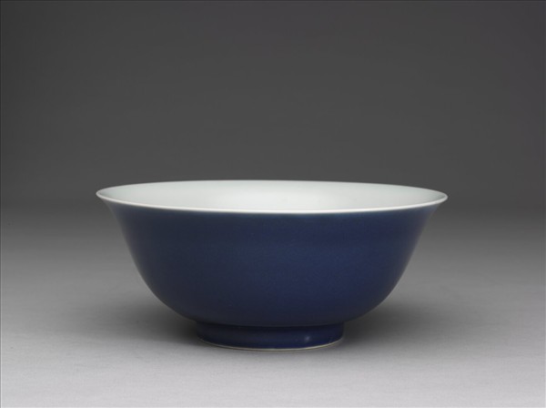 撇口,弧壁,矮圈足。內壁白釉上印飾雙龍雲紋,碗心刻畫一折帶雲紋。外施霽青釉,橘皮紋清楚,白釉泛青。胎壁勻薄,圈足露胎,質堅細膩,胎釉一線呈淺橘色。器底白釉下青花書「大明宣德年製」二行六字楷款,外加雙圈。