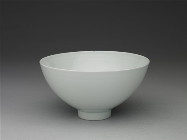 敞口,深壁上豐下斂,尖底,矮圈足,俗稱「蓮子碗」。胎質較薄,通體施甜白釉,樸素無紋飾。底有青花書「大明宣德年製」六字二行楷款,外加雙圈。