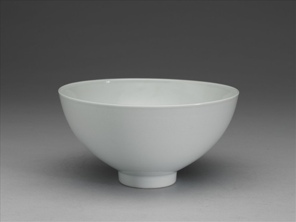 敞口,深壁上豐下斂,尖底,矮圈足,俗稱「蓮子碗」。胎質較薄,通體施甜白釉,樸素無紋飾。底有青花書「大明宣德年製」六字二行楷款,外加雙圈。