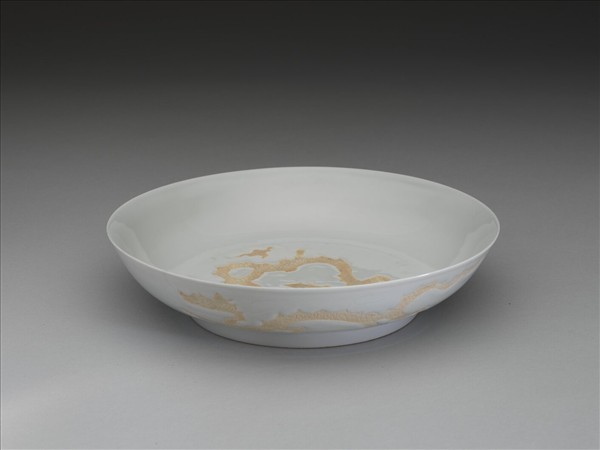 侈口,淺壁,矮圈足。盤心與外壁刻劃雲龍三條,隙地淺劃波濤、山石。內壁純白無紋飾。胎質稍厚,釉色甜白,龍紋均露胎,未施釉彩。底有青花書「大明弘治年製」六字二行楷款,外加雙圈。