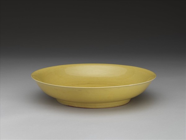 侈口,淺壁弧形,矮圈足。胎質較薄,器內外壁滿施嬌黃釉,盤底純白,樸素無紋飾。底有青花書「大明弘治年製」六字二行楷款,外加雙圈。