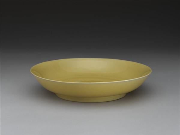 侈口,淺壁弧形,矮圈足。胎質較薄,器內外壁滿施嬌黃釉,盤底純白,樸素無紋飾。底有青花書「大明弘治年製」六字二行楷款,外加雙圈。