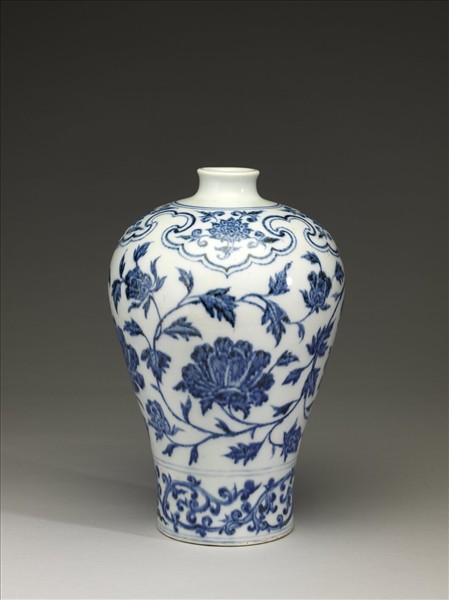 本件永樂時期的瓶子,口部小,肩部豐滿,腹部內斂,帶淺圈足的瓶子稱為「梅瓶」。梅瓶是北宋時創燒的一種瓶式,經宋、元、明、清連綿千年,燒製不輟。宋代梅瓶修長纖麗,口部小而外捲,元代梅瓶高大雄偉,頸部常呈梯形,明代初年的梅瓶尺寸較小,圓潤的肩部為其特色。這件梅瓶除瓶底無釉露胎外,全器皆以濃豔青花為飾。梅瓶肩部豐滿,肩上畫四組雙鉤如意雲肩,其內畫折枝番蓮花。腹部畫纏枝牡丹花,近器底處畫纏枝花紋一周。
