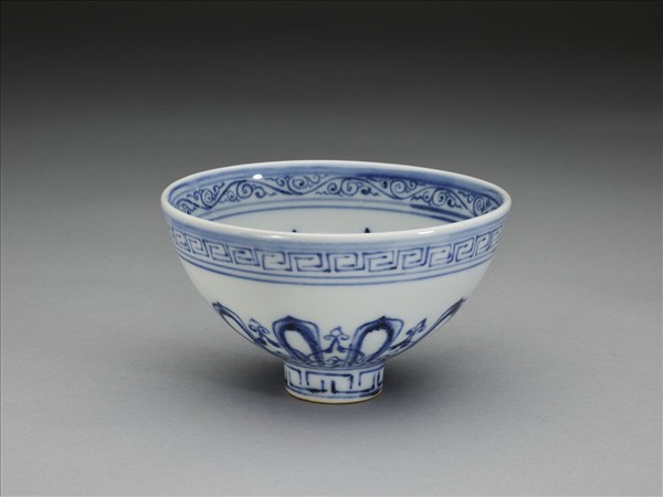 敞口,深壁上豐下斂,尖底,矮圈足,俗稱「蓮子碗」。薄胎白釉。碗內口沿下畫卷草紋一周,碗心為四瓣圖案花一朵,外加回紋、阿拉伯圖案紋各一層。外壁畫蓮瓣紋一周,加飾桃形圖案,口沿下及足圈各畫回紋一周。