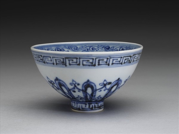 敞口,深壁上豐下斂,尖底,矮圈足,俗稱「蓮子碗」。薄胎白釉。碗內口沿下畫卷草紋一周,碗心為四瓣圖案花一朵,外加回紋、阿拉伯圖案紋各一層。外壁畫蓮瓣紋一周,加飾桃形圖案,口沿下及足圈各畫回紋一周。