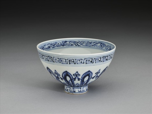 敞口,深壁上豐下斂,尖底,矮圈足,俗稱「蓮子碗」。薄胎白釉。碗內口沿下畫卷草紋一周,碗心為四瓣圖案花一朵,外加回紋、阿拉伯圖案紋各一層。外壁畫蓮瓣紋一周,加飾桃形圖案,口沿下及足圈各畫回紋一周。