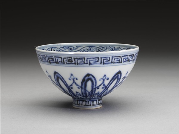 敞口,深壁上豐下斂,尖底,矮圈足,俗稱「蓮子碗」。薄胎白釉。碗內口沿下畫卷草紋一周,碗心為四瓣圖案花一朵,外加回紋、阿拉伯圖案紋各一層。外壁畫蓮瓣紋一周,加飾桃形圖案,口沿下及足圈各畫回紋一周。