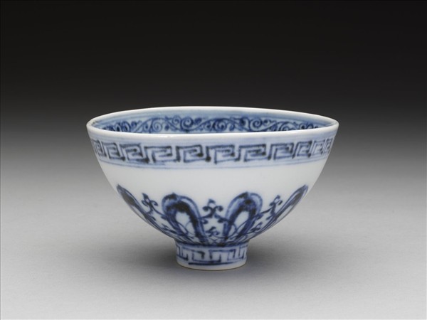 敞口,深壁上豐下斂,尖底,矮圈足,俗稱「蓮子碗」。薄胎白釉。碗內口沿下畫卷草紋一周,碗心為四瓣圖案花一朵,外加回紋、阿拉伯圖案紋各一層。外壁畫蓮瓣紋一周,加飾桃形圖案,口沿下及足圈各畫回紋一周。
