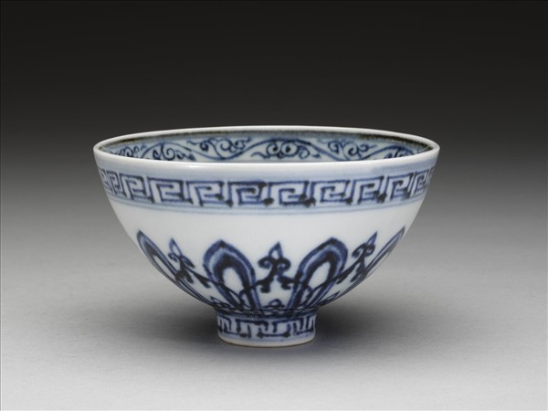 敞口,深壁上豐下斂,尖底,矮圈足,俗稱「蓮子碗」。薄胎白釉。碗內口沿下畫卷草紋一周,碗心為四瓣圖案花一朵,外加回紋、阿拉伯圖案紋各一層。外壁畫蓮瓣紋一周,加飾桃形圖案,口沿下及足圈各畫回紋一周。