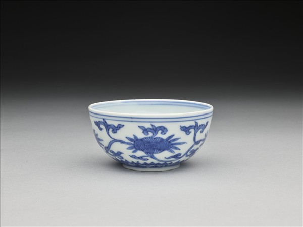 敞口,深弧壁,凸底,矮圈足。外壁畫纏枝靈芝四朵,底邊畫蓮瓣紋一周。碗心畫五瓣花圖案,內壁純白無紋飾。內外加飾青線七道。底有青花書「大明嘉靖年製」六字二行楷款,外加雙圈。