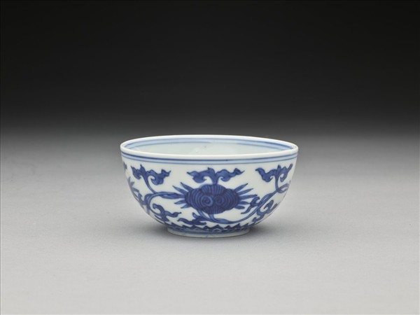 敞口,深弧壁,凸底,矮圈足。外壁畫纏枝靈芝四朵,底邊畫蓮瓣紋一周。碗心畫五瓣花圖案,內壁純白無紋飾。內外加飾青線七道。底有青花書「大明嘉靖年製」六字二行楷款,外加雙圈。