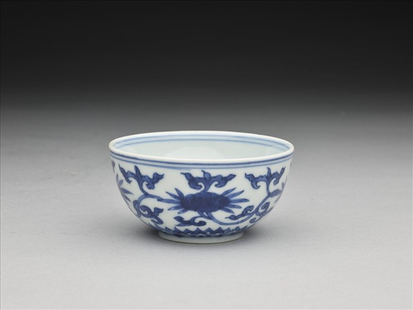 敞口,深弧壁,凸底,矮圈足。外壁畫纏枝靈芝四朵,底邊畫蓮瓣紋一周。碗心畫五瓣花圖案,內壁純白無紋飾。內外加飾青線七道。底有青花書「大明嘉靖年製」六字二行楷款,外加雙圈。