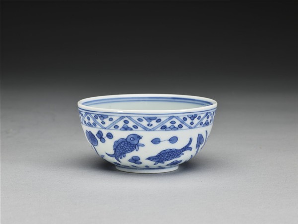 敞口,深壁,凸底,矮圈足。外口沿下畫尖角花瓣紋一道,周壁畫蓮塘水藻及游魚。杯內底心畫魚一尾,加飾水藻,內壁純白無紋飾。內外分飾青線八道。底有青花書「大明嘉靖年製」六字二行楷款,外加雙圈。