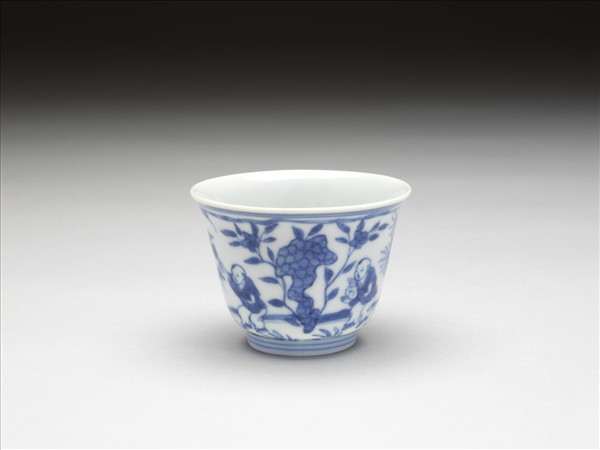 侈口,深壁,矮圈足。外壁畫童子嬉戲,加飾芭蕉、樹石等,口足分飾青線五道。內面純白,樸素無紋飾。底有青花書「大明嘉靖年製」六字二行楷款,外加雙圈。杯型小巧,人物描繪細緻,釉色清雅具康熙青料特色。