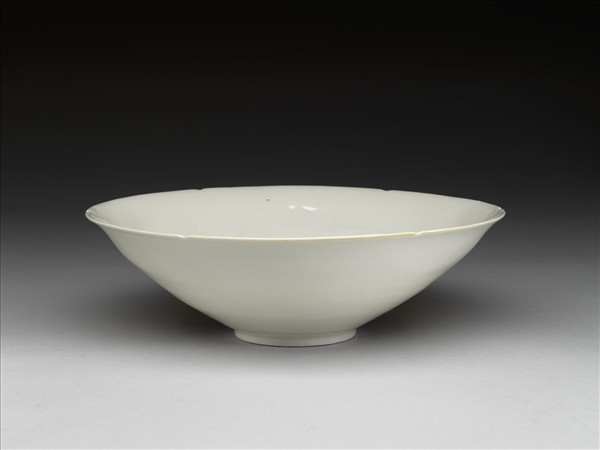 六瓣葵花形口,深壁,矮圈足。甜白釉,內壁錐拱龍紋,碗心錐拱「永樂年製」四字二行篆體暗款,外加單圈,周飾雲紋。外壁純白,樸素無紋飾。