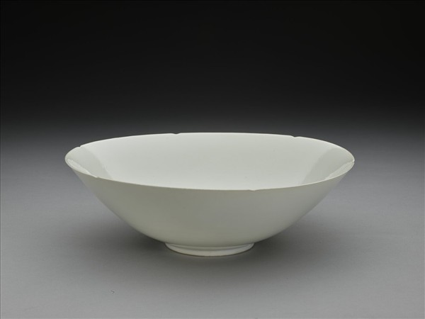 六瓣葵花形口,深壁,矮圈足。甜白釉,內壁錐拱龍紋,碗心錐拱「永樂年製」四字二行篆體暗款,外加單圈。外壁純白,樸素無紋飾。