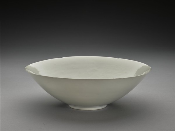 六瓣葵花形口,深壁,矮圈足。甜白釉,內壁錐拱龍紋,碗心錐拱「永樂年製」四字二行篆體暗款,外加單圈。外壁純白,樸素無紋飾。