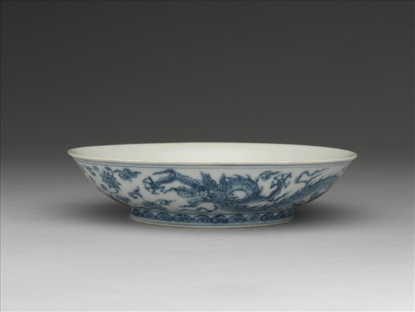 侈口盤,淺弧壁,矮圈足。器內純白,樸素無紋飾;外壁畫青龍二條,隙地加飾纏枝番蓮花,足圈有如意雲一周,外口沿、底邊及圈足各飾青花弦紋二道。