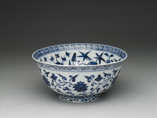 侈口碗,深弧壁,矮圈足。薄胎白釉。碗內口沿畫回紋一周,內壁畫轉枝牡丹、菊花等六朵,碗內心畫有青花雙圈,內繪牡丹一枝;外口沿飾勾雲紋一周,外壁有轉枝番蓮六朵,底邊描蓮瓣紋一圈,足圈畫回紋。內外口沿、周壁及圈足間之紋飾皆以青花弦紋區隔。