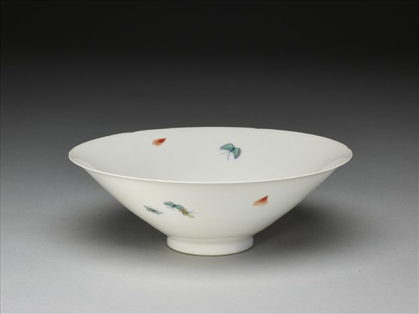六瓣葵花形口,深壁,矮圈足。器內外均畫有淡紅梅瓣,飾以彩蝶數隻。半脫胎,甜白釉,花蝶表裏可互見。底有青花書「大明成化年製」六字二行楷款,外加雙圈。繪畫筆觸細膩,利用漸層色填彩是清康熙特色,有別於成化彩瓷慣用的平塗法。