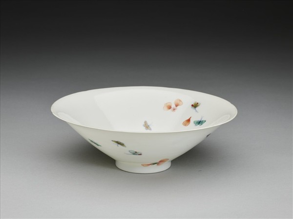 六瓣葵花形口,深壁,矮圈足。器內外均畫有淡紅梅瓣,飾以彩蝶數隻。半脫胎,甜白釉,花蝶表裏可互見。底有青花書「大明成化年製」六字二行楷款,外加雙圈。