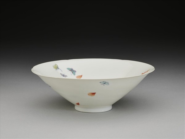 六瓣葵花形口,深壁,矮圈足。器內外均畫有淡紅梅瓣,飾以彩蝶數隻。半脫胎,甜白釉,花蝶表裏可互見。底有青花書「大明成化年製」六字二行楷款,外加雙圈。