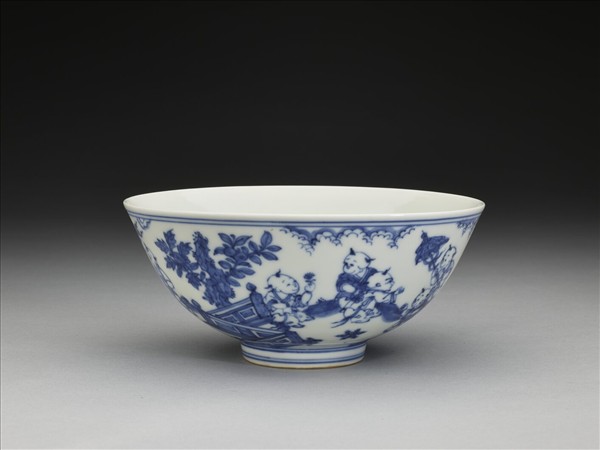 侈口,深壁,矮圈足。碗內樸素無紋飾,碗外壁繪庭院嬰戲圖,襯以圍欄、樹石、花卉、雲層。底有青花書「大明成化年製」六字二行楷款,外加雙圈。