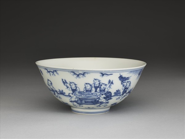 侈口,深壁,矮圈足。碗內樸素無紋飾,碗外壁繪庭院嬰戲圖,襯以圍欄、樹石、花卉、雲層。底有青花書「大明成化年製」六字二行楷款,外加雙圈。