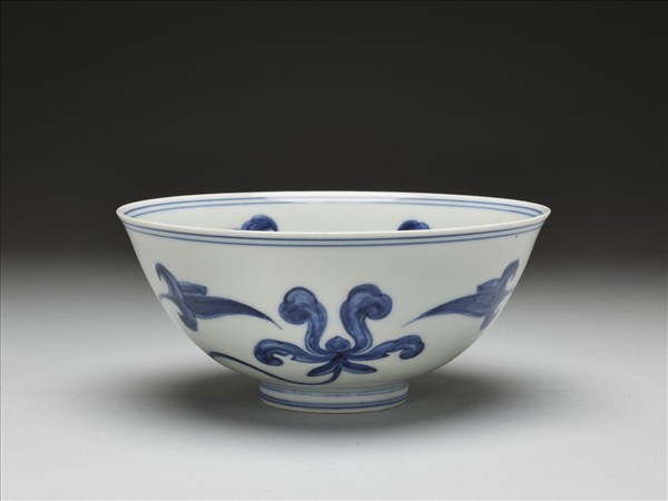 侈口,深壁,矮圈足。內外壁各畫萱草二組。碗心畫萱草一朵,內外分飾青線九道。底有青花書「大明成化年製」六字二行楷款,外加雙圈。