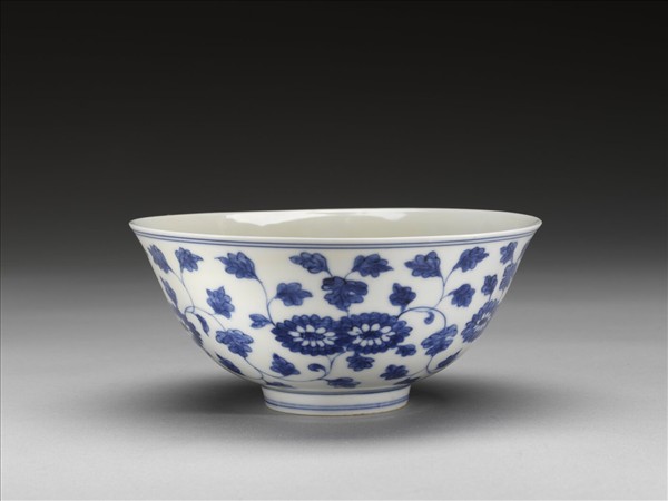 侈口,深壁,矮圈足。外壁畫纏枝菊花十朵,口足加飾青線六道。內面純白,樸素無紋飾。底有青花書「大明成化年製」六字二行楷款,外加雙圈。