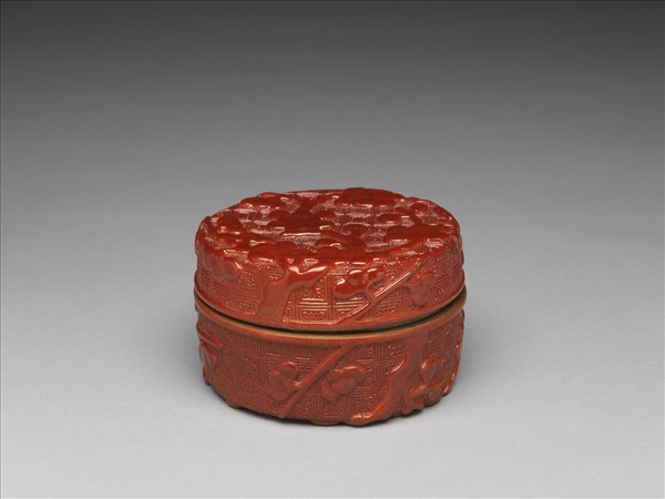 全器作圓盒形,分蓋與身兩部分。器表以仿雕漆的手法,錐畫出朵花錦地紋,底紋之上再堆拱出梅幹與花朵,最後罩施紅釉,形成仿如漆器剔紅的質感與效果。乾隆時期,足以表現多層次美感的剔紅漆器再度受到重視與喜愛,許多作品因而被創作出來。此在瓷胎器表以仿雕漆技法來裝飾的表現,或與剔漆再度流行有關。